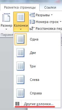 У нас показывается меню, в котором можно выбрать, на сколько колонок разбивать текст. Нам это не сильно нужно, мы выбираем пункт «Другие колонки».