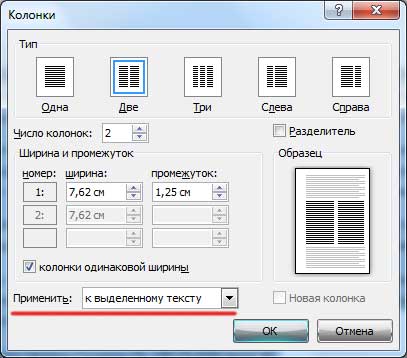 Смотрим на пункт «Число колонок», я указываю цифру 2. Напротив пункта «Применить» выбираем «к выделенному тексту». Также в этом окошке можно выбирать ширину колонки и ширину промежутка между колонками: