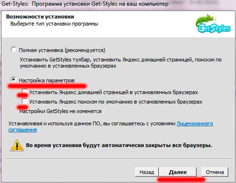 Теперь принимаем соглашение пользователя и переходим к возможностям установки. Если оставить галочку на «Полная установка», то вам будет установлено все то, что перечислено под ней. Если вас это не устраивает, и вы хотите только эту программу, нажмите «Настройка параметров», и снимите галочки. Во время установки браузеры будут автоматически закрыты, сохраните закладку с данной статьей, чтобы открыть ее после установки. Нажимаем «Далее»