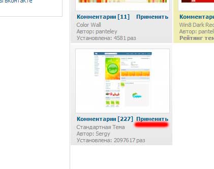 Как сделать фон вконтакте другим разобрались, теперь как вернуть стандартное оформление. Снова таки переходим на этот сайт, листаем любую их страницу с темами, и в самом низу будет страница со стандартной темой, нажимаем «применить» и все снова вернётся, как было.