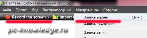 Запускаем программу. В верхнем меню выбираем «инструменты» - «запись экрана» или «Record the screen»