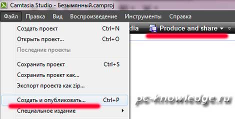 Теперь нажимаем «файл» - «создать и опубликовать» или же «produce and share»