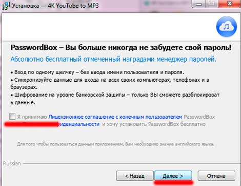 После загрузки, запускаем установку. Выбираем русский язык, жмем «далее» до тех пор, пока не появится окошко с предложением установить что-то еще. Снимаем галочку и нажимаем «далее»