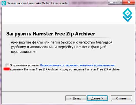 Еще одну галочку, в окне «Загрузить Hamster Free Zip Archiver» - снимаем, чтобы не устанавливать дополнительный архиватор.