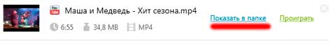 Все, загрузка пошла, чтобы открыть видео, можем нажать «Проиграть» или «Показать в папке» скачанный файл.
