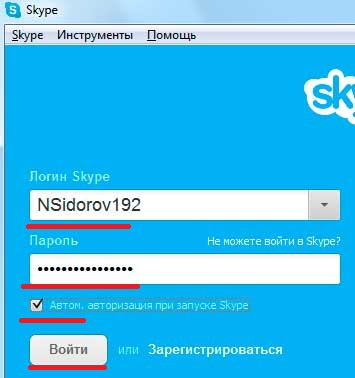 Теперь в поле «Логин Skype» вводим другое имя пользователя, а в поле «Пароль» пароль другого пользователя. Если поставить галочку «Автоматическая авторизация при запуске Skype», то каждый раз, когда включается скайп, будет сразу входить этот новый логин. Нажимаем кнопочку «Войти»