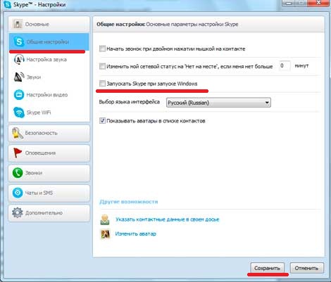 В левом столбике выбираем пункт «Общие настройки» и в окне «Основные параметры настройки Skype» ставим галочку на третей надписи «Запускать Skype при запуске Windows» если хотим, чтобы после загрузки вашего компьютера включалась программа, либо в противном случае наоборот убираем ее. Нажимаем «Сохранить», чтобы настройки вступили в силу.