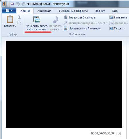 Открывается окошко программы и во вкладке «Главная» нажимаем на кнопку «Добавить видео и фотографии».
