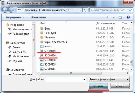 Ищем на компьютере наши видеоролики, которые необходимо склеить. Выделяем их левой кнопкой мыши, зажав клавишу Ctrl. Нажимаем кнопку «Открыть».