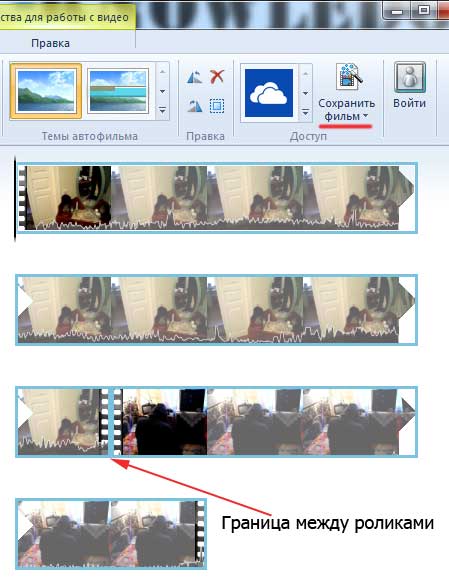 В рабочую область добавились наши два ролика, нажимаем на кнопочку «Сохранить фильм».