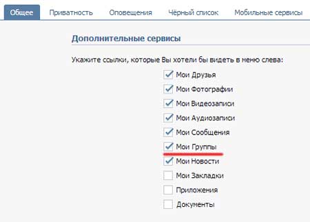 Смотрим на вкладку «Общее». Там написано: «Укажите ссылки, которые вы бы хотели видеть в меню слева». Ставим птичку напротив пункта «Мои Группы» и настройки у нас автоматически сохраняются.