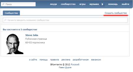 Нам выдается список групп, в которых мы состоим. Я специально подписался на одну из групп, чтобы хотя бы что-нибудь было в списке. Обращаем внимание на ссылочку в правом верхнем углу, которая называется «Создать сообщество». Это как раз то, что нам нужно, жмем на нее.