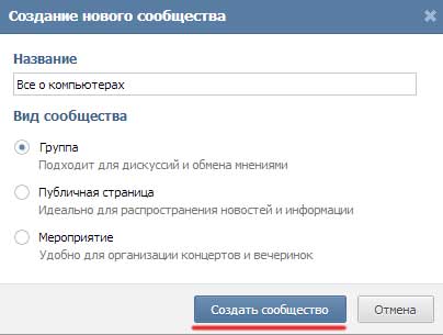 У нас выскакивает окошко, в котором необходимо ввести название нашего сообщества и выбрать его вид. Название у меня будет «Все о компьютерах», а вид естественно «Группа». После того, как все заполнено и выбрано, нажимаем на кнопку «Создать сообщество».
