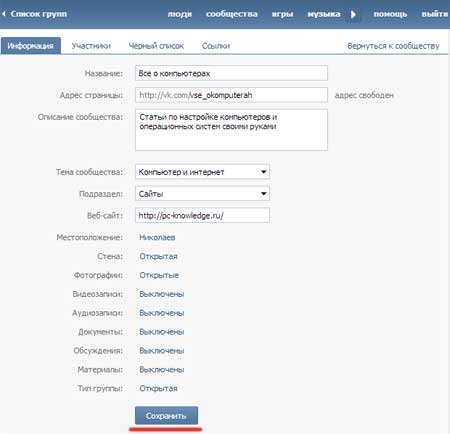 В следующем окошке нам необходимо заполнить всю основную информацию, которая будет касаться нашей группы. Хочу обратить ваше внимание на поле адрес страницы, его можно сделать каким-нибудь более оригинальным, нежели club1111111 или что-нибудь в этом роде. Я, например, сделал адрес: vse_okomputerah.
