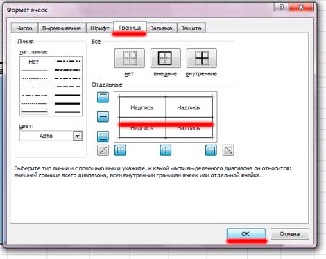Переходим на закладку «Граница». Тут мы рисуем границы таблицы внутри и снаружи. В окошке посередине понажимаете мышкой, чтобы указать конкретные границы, после чего нажмите «ОК»