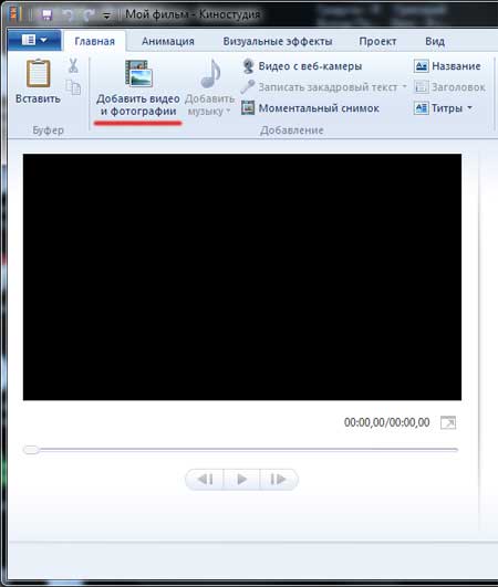 Запускаем программу и нажимаем на кнопку в панели инструментов во вкладке «Главная» «Добавить видео и фотографии».