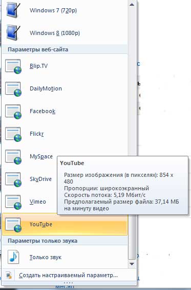 Если навести мышку на каждый из шаблонов, то можно увидеть предполагаемый размер вашего будущего ролика на одну минуту потока. Пробежавшись по всем шаблонам можно найти для себя идеальный вариант. Я обычно снимаю ролики на фотоаппарат. По объему они достаточно большие, а по времени короткие. Чтобы их сжать я использую шаблон «YouTube», который и выбираю на этот раз.