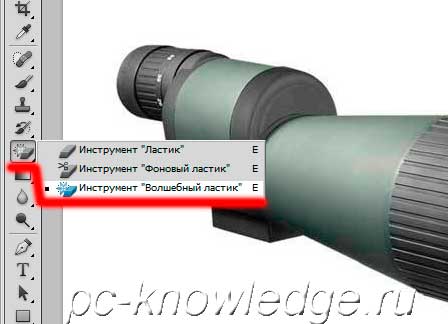 Существует несколько способов избавиться от белого фона, и мы рассмотрим, начиная с самого простого. Открываем картинку или изображение с помощью «Photoshop». Слева, на панели есть инструмент под названием «ластик», нажимаем на него правой кнопкой мышки. Выйдет 3 варианта ластика. Выбираем инструмент «волшебный ластик»