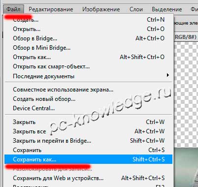 Сохранить картинку без фона необходимо следующим образом. Жмем «файл», переходим на строчку «сохранить как» (для сжатия рисунка можно «сохранить для web и устройств»).