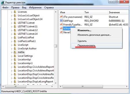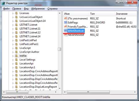 В редакторе реестра находим ветку: HKEY_CLASSES_ROOT\lnkfile (хочу обратить внимание, что в слове lnkfile первая буква – это английская л.) Справа находим параметр «IsShortcut»