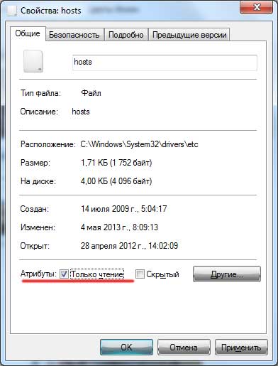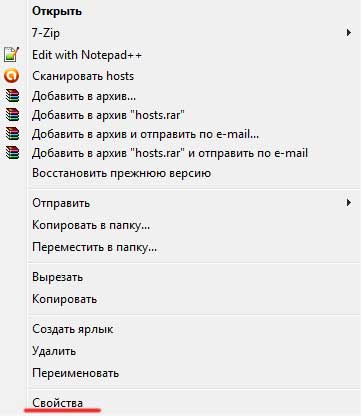 Если вы не хотите, чтобы ваш файл был подвержен модификации со стороны вредоносных программ, то можно сделать следующее. Кликаем правой кнопкой по файлу и из выпавшего меню выбираем «Свойства».