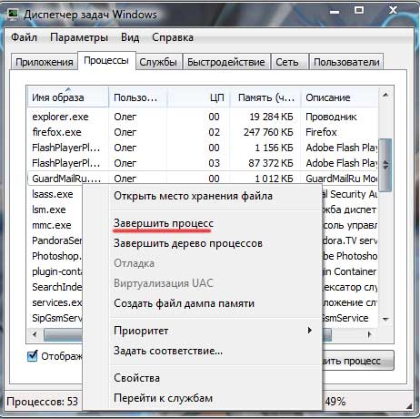 Шаг второй. Отключаем соответствующий процесс. Жмем Alt+Ctrl+Del и заходим в диспетчер задач и ищем процесс GuardMailRu. Кликаем по нему правой кнопкой мыши и из выпавшего меню выбираем пункт «Завершить процесс».