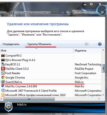 Шаг третий. Жмем «Пуск – Панель управления – Программы и компоненты». Ищем там Guard mail.ru и жмем вверху на «Удалить/Изменить»