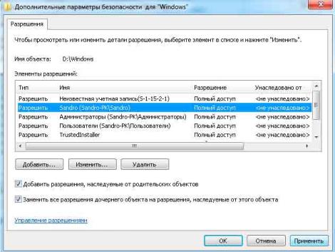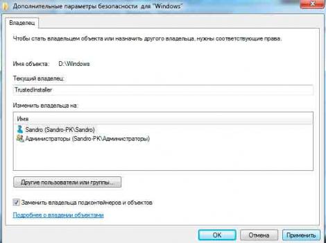 В открывшимся окне выбираем вкладку Владелец. Для 7-ки дополнительное действие, жмем "Изменить". В окошке «Изменить владельца на:» выбираем свою учетную запись. В моем случаем это Sandro. Ставим галочку «Заменить владельца субконтейнеров и объектов» жмем Ок.