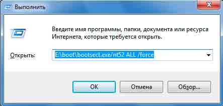 Находясь в операционной системе Windows XP, вставляем установочный диск с windows 7. Нажимаем Пуск-Выполнить (или клавиши Win+R). Вводим команду (Буква CD-ROM):\boot\bootsect.exe /nt52 ALL /force