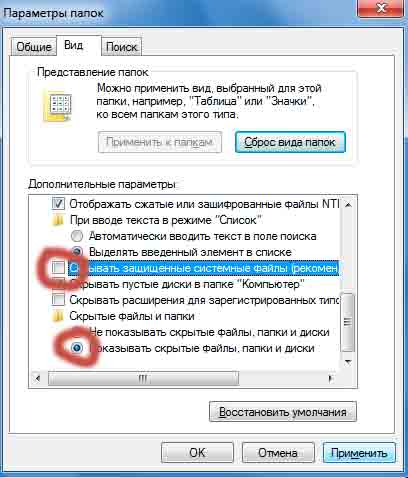 Снимаем флажок с поля «Скрывать защищенные системные файлы» и установите переключатель в скрытых файлах и папках на «Показывать скрытые файлы и папки»