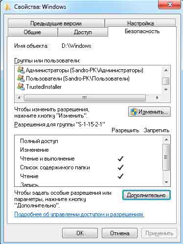 Далее в разделе Безопастность жмем Дополнительно. Переходим во вкладку «Разрешения» Выбираем свою учетку. Ставим обе галочки.