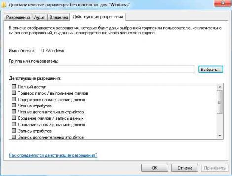 Жмем опять правой кнопкой мышки по выбранной папке – Свойства. Переходим во вкладку Действующие разрешения и нажимаем Выбрать.