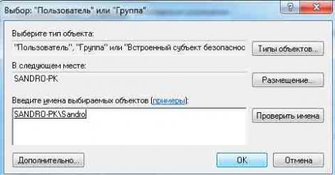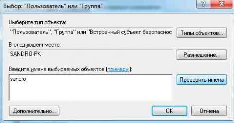 В окне «Введите имена выбираемых объектов» пишем имя вашей учетной записи. В моем случаем «Sandro».
