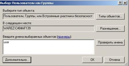В поле "Введите имена выбираемых объектов" введите имя своего пользователя, в моем случае это user. Жмем OK.
