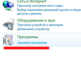 В левой колонке в самом низу в разделе «Программы» нажимаем на «Удаление программы»