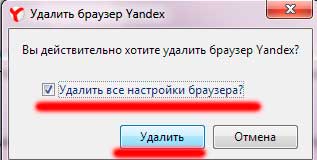 Высветиться окошко «Вы действительно хотите удалить браузер Yandex?» Ставим галочку на «Удалить все настройки браузера?» и жмем «Удалить»