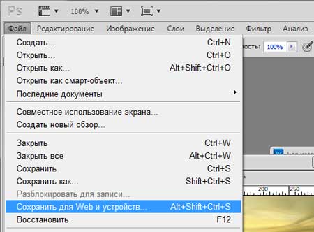 Далее необходимо уменьшить объем занимаемого дискового пространства и заодно и сразу сохранить фотографию. Жмем «Файл – Сохранить для Web и устройств».