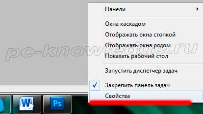 Нажимаем правую кнопку мышки на пустом месте панели задач, которая находиться снизу. Если пустого места нет, жмем правую кнопку на пуске. Выбираем «Свойства»