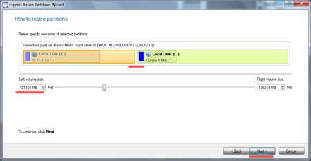 Указываем в МБ насколько мы хотим увеличить наш диск С. Это можно сделать, указав конкретное число в поле либо просто потянуть за границу межу разделами. Жмем «Next».