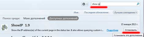 В закладке «получить дополнения», справа сверху есть строка «поиск среди дополнений». Вводим туда «show ip», жмем «Enter». В результатах поиска напротив нашего дополнения «Show ip» жмем «Установить»