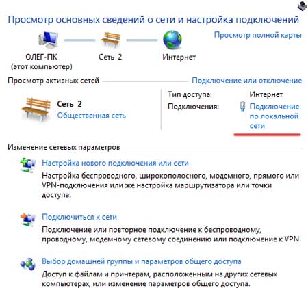 В открывшемся окошке ищем ссылку под названием «Подключение по локальной сети».