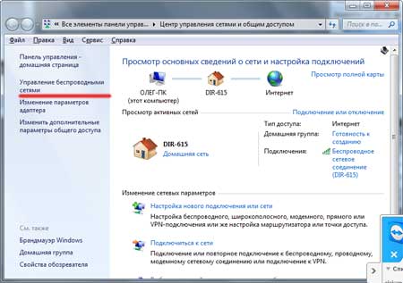 У нас открывается окошко, в котором в левой колоночке мы находим пункт «Управление беспроводными сетями» и кликаем по нему.