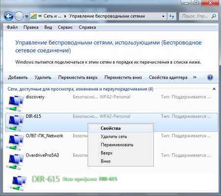 Далее у нас открывается окошко со списком устройств, к которым когда-либо подключался данный ноутбук через wi-fi. Находим нужный нам роутер и кликаем по нему правой кнопкой мыши, выбираем пункт «Свойства».