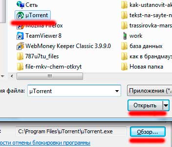 Откроется список программ. Мы можем выбрать из списка, или самому найти нужное приложение. Для этого, нужно нажать «обзор» и выбрать файл запуска программы, или ярлык, который, к примеру, находится на рабочем столе. Брандмауэр понимает, что это ярлык, и сам найдет расположение программы.