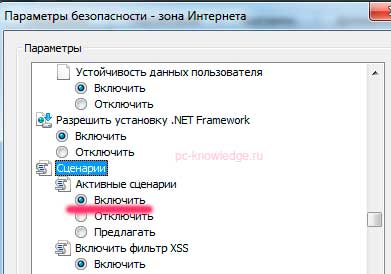 Опускаем ползунок в новом окошке вниз, до поля «Сценарии». Тут, в «Активные сценарии» ставим переключатель на «Включить». После чего два раза нажимаем «ОК»