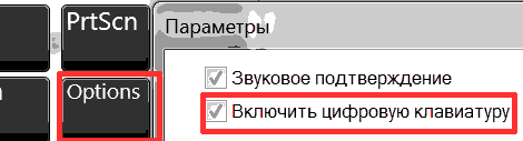 Теперь, на экране будет имитация клавиатуры, но возможно опять-таки без поля «Num». Находим кнопку «Options» на экранной клавиатуре, нажимаем на нее, и в появившемся окошке ставим галочку на поле «Включить цифровую клавиатуру».