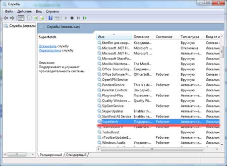 На всякий случай проверьте, включена ли у вас служба SuperFetch. Для этого зайдите «Пуск» и напишите в строке поиска «Службы».