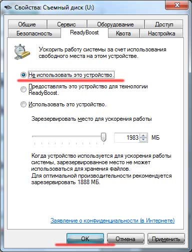 Переходим во вкладку «ReadyBoost» и ставим переключатель в положение «Не использовать это устройство».