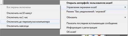 Кликаем по ней правой кнопкой мыши и выбираем пункт «Управление экранами avast!». Далее выбираем пункт, который нам нужен. То есть, насколько отключать экраны.