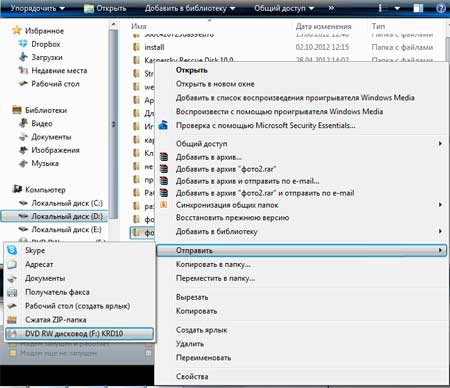 Для этого необходимо кликнуть правой кнопкой мыши по папке и выбрать пункт меню «Отправить – DVD RW дисковод».